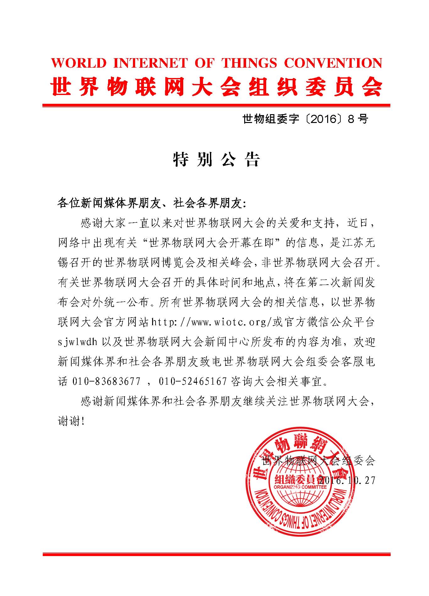世界物联网大会特别公告